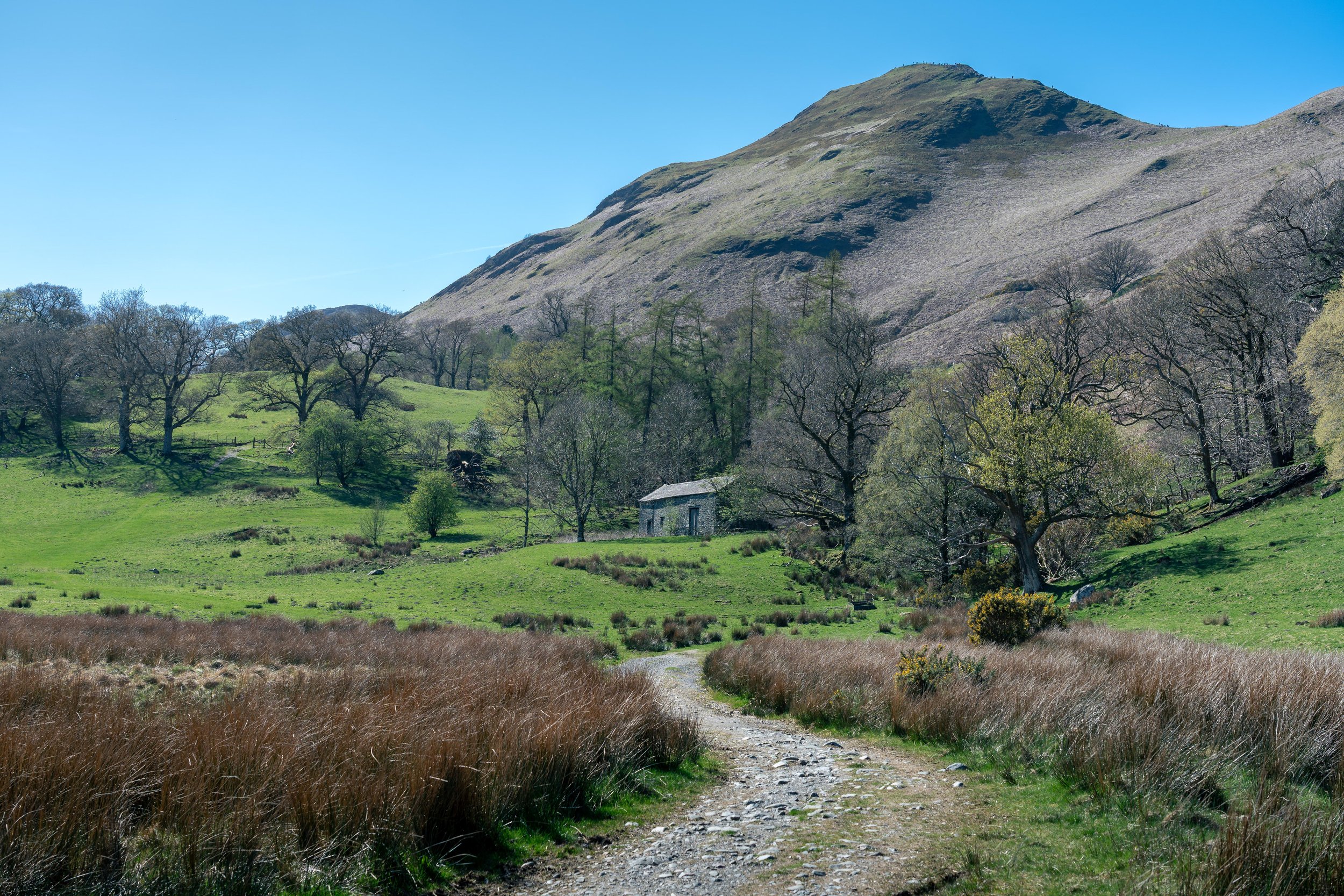 This was a happy find on our way around the first half of the lake. The wider shot here was my original composition, trying to capture the feeling of solitude amongst the hills and trees, using the dark grasses as a foreground, and the path leading you up to the building tucked in the middle of the trees. Let’s just say that any photo with sky in would have been preferred with clouds or at least some other interest up there. This one, however, cuts most of it out, so it’s not so bad. Also, softer light would have been preferable on most of them, too.